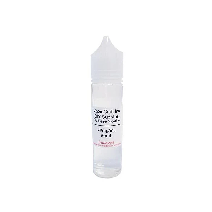High Quality DIY Nicotine - PG Base 48mg/mL - 60mL. Warning: Nicotine is TOXIC and must be kept out of reach of children and pets. Use personal protective equipment during your formulations. Vape Craft Inc will not be held responsible for the misuse or mishandling of this product. CA PROP 65 contents. DO NOT VAPE PURE NICOTINE!